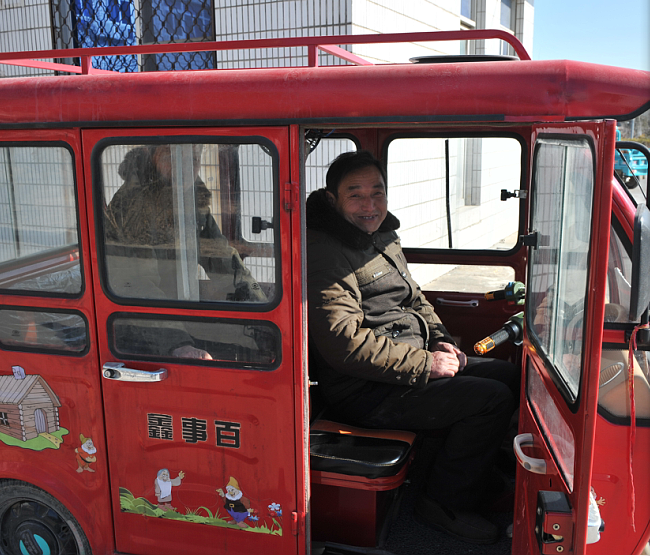 畫面中的駕駛員是淮海農(nóng)場四分場社區(qū)54歲的黃玉青,弱智又低收入的他,每月靠400元的低保維持著簡單的生活。2017年農(nóng)場組織科長林一高和四分場二十八大隊隊長王扣林與其結(jié)成精準(zhǔn)幫扶對子后,他在獲得幫扶的同時,也更是激發(fā)了黃玉青自主創(chuàng)業(yè)的動力。黃玉青每天開著一輛百事鑫電動三輪車,停泊在醫(yī)院門前接客,在方便他人的同時,也為自己增加了收入。瞧,載著客人的黃玉青笑得是多么地燦爛。