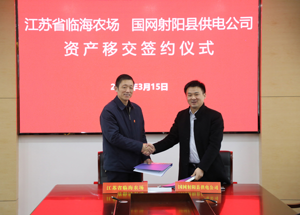 3月15日,江蘇省臨海農(nóng)場(chǎng)與國網(wǎng)江蘇省電力有限公司射陽縣供電分公司在農(nóng)場(chǎng)綜合樓七樓會(huì)議室舉行電力資產(chǎn)移交簽約儀式,農(nóng)場(chǎng)黨委書記、場(chǎng)長賀在銳,射陽縣供電分公司總經(jīng)理王愛軍在資產(chǎn)移交協(xié)議上簽字,標(biāo)志著農(nóng)場(chǎng)分離辦社會(huì)職能改革進(jìn)入實(shí)質(zhì)性階段。