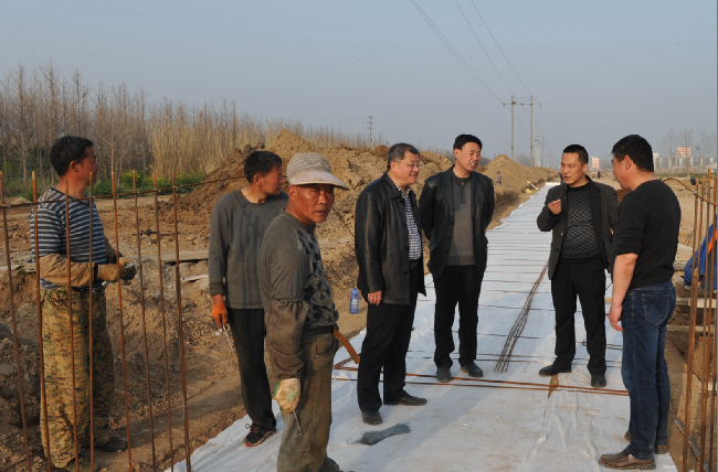 5點15分,當李衛東一行驅車來到農場神禾路旁的一支渠駁岸現場時,橋頭旁的10多名工人正在用水泥澆鑄駁岸碼頭和流水口。李衛東一行走到河旁查看和了解了水泥駁岸的生產進度和質量情況,并對隨行人員就農場下一步河長治的規劃和美麗淮海的建設情況,進行了探討。