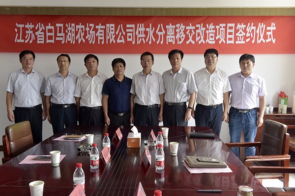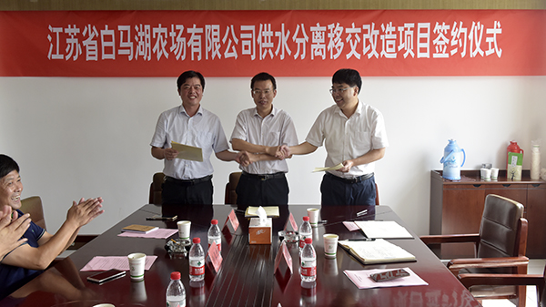 黨委書記、董事長、總經(jīng)理姚春華首先致辭,向參加簽約儀式的各位領(lǐng)導(dǎo)表示熱烈的歡迎和衷心的感謝!指出,白馬湖供水分離移交改造工程是根據(jù)中共中央國務(wù)院、省委省政府關(guān)于農(nóng)場改革發(fā)展的文件精神,結(jié)合《淮安區(qū)區(qū)域供水規(guī)劃》和白馬湖實際,經(jīng)與區(qū)政府及其相關(guān)部門多次溝通交流達成的共識。項目總投資1472.39萬元,涉及職工居民4328戶,改造鋪設(shè)二三級管網(wǎng)235km。自2016年9月以來,作為農(nóng)場公司最大的民生實事之一,供水改造工作得到了區(qū)委區(qū)政府的高度重視和積極推進,得到了各級領(lǐng)導(dǎo)的熱情關(guān)心和傾力支持,確保了改造工程在立項申報、政策落實、方案對接和措施推進等方面一直走在墾區(qū)前列,得到了省國資委和集團公司的充分肯定,整個對接過程傾注和凝聚了各級領(lǐng)導(dǎo)的辛勤汗水和不懈努力。該工程完成后,將有效改善場域自來水水質(zhì)水壓,實現(xiàn)與城市供水同網(wǎng)同質(zhì)同價,將極大改善職工居民的生活質(zhì)量,提高職工群眾的健康水平,對提升職工群眾的幸福感和獲得感,對促進社會和諧、增進民生福祉具有重要的現(xiàn)實意義。他相信,隨著工程項目的簽約和啟動,必將開啟白馬湖改革發(fā)展、民生事業(yè)改善和場地合作共贏的新篇章。