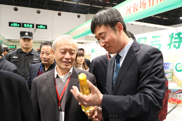 交易會開幕當(dāng)日,江蘇省農(nóng)業(yè)農(nóng)村工作領(lǐng)導(dǎo)小組副組長胥愛貴等領(lǐng)導(dǎo)巡館來到江蘇農(nóng)墾展館,在集團(tuán)公司企劃部負(fù)責(zé)人和朱明亮的陪同下,專程到臨海農(nóng)場公司展位調(diào)研指導(dǎo)。朱明亮向領(lǐng)導(dǎo)介紹,近年來農(nóng)場公司按照省委和集團(tuán)公司黨委的統(tǒng)一部署,利用資源和組織化優(yōu)勢,推進(jìn)企業(yè)高質(zhì)量發(fā)展,推動產(chǎn)業(yè)提檔升級,塑造生態(tài)健康農(nóng)副產(chǎn)品。可以生吃的健康油“綠農(nóng)園”牌牡丹籽油就是公司推出的優(yōu)質(zhì)精品之一。胥愛貴說,知道臨海農(nóng)場在射陽縣境內(nèi),對臨海農(nóng)場公司種植油用牡丹、發(fā)展牡丹籽油產(chǎn)業(yè)的情況有所了解。他指出,江蘇農(nóng)墾及臨海農(nóng)場公司要在推進(jìn)現(xiàn)代農(nóng)業(yè)建設(shè)和推進(jìn)質(zhì)量可追溯的健康農(nóng)副產(chǎn)品方面發(fā)揮示范引領(lǐng)作用;要通過交易會這個平臺,推出更多、更好的優(yōu)質(zhì)農(nóng)副產(chǎn)品給上海大眾,展示江蘇現(xiàn)代農(nóng)業(yè)發(fā)展的成就,讓上海各界人士更好地了解江蘇及品味江蘇優(yōu)質(zhì)農(nóng)產(chǎn)品。一同參加巡館的江蘇省糧食局夏春勝局長詳細(xì)詢問了“綠農(nóng)園”牌牡丹籽油的種植、生產(chǎn)、品牌開發(fā)及經(jīng)營銷售等情況。