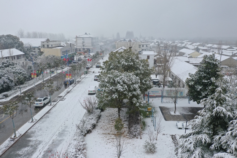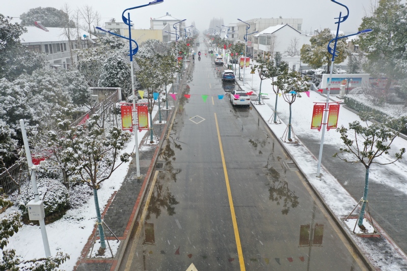 高大的銀杏樹、柿子,落光了葉子的枝杈上一條條毛茸茸、亮晶晶的銀條兒好像蟄伏著的蠶蟲;修長的香樟、低矮的柏樹,四季常青枝葉上一朵朵蓬松松、沉甸甸的雪球,仿佛舉起的棉花糖。“呼……”一輛晨起的公交車閃著光駛過,一面面紅旗也迎風雀躍起來,似乎在說“又是一個豐收年”。
