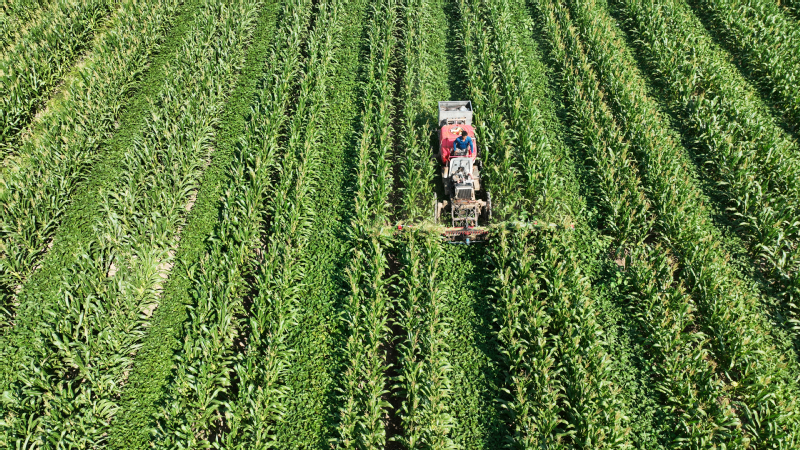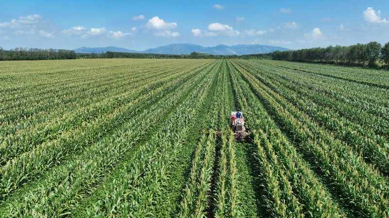 蘇墾農(nóng)發(fā)抓好12萬(wàn)畝玉米大豆帶狀復(fù)合種植精細(xì)化管理,在去年成功試驗(yàn)的基礎(chǔ)上,組織農(nóng)機(jī)對(duì)玉米進(jìn)行去頂,既降低植株高度,減少倒伏風(fēng)險(xiǎn),又增加了玉米大豆受光面積,促進(jìn)產(chǎn)量提高。圖為農(nóng)機(jī)在蘇墾農(nóng)發(fā)東辛分公司玉米大豆田間進(jìn)行玉米去頂作業(yè)。