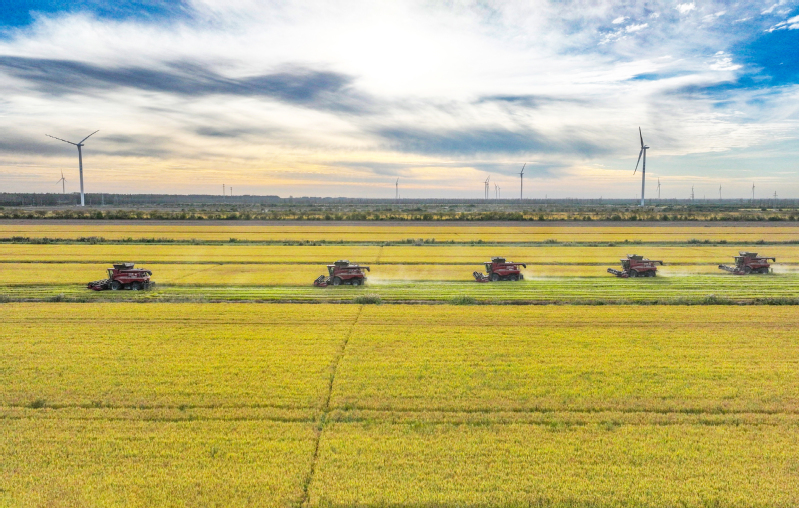 2023年10月28日,在蘇墾農(nóng)發(fā)新洋分公司新南生產(chǎn)區(qū)19大隊(duì)的高標(biāo)準(zhǔn)農(nóng)田上,五臺(tái)凱斯7088大型聯(lián)合收割機(jī)穿梭在稻田中搶收水稻。蘇墾農(nóng)發(fā)新洋分公司搶抓晴好天氣,發(fā)揮農(nóng)墾企業(yè)機(jī)械化優(yōu)勢(shì),確保秋糧顆粒歸倉(cāng)。
