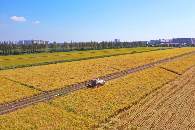10月9日,臨海農場的稻田里機聲轟鳴,1000畝早熟水稻品種“武育粳702”首塊田正式開鐮收割。