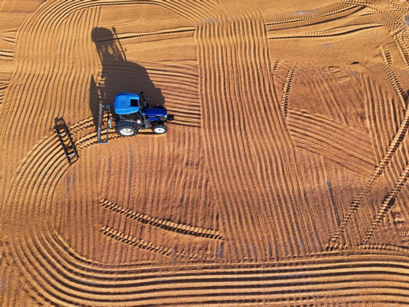 隨著天氣轉好,崗埠農場加緊推進秋糧收獲、晾曬等工作。圖為10月22日,崗埠農場職工駕駛翻糧機械,利用晴好天氣晾曬玉米。在藍天白云的映照下,翻糧機在金色的玉米上劃出一道道優美的弧線,刻畫出秋日的美好“豐”景。