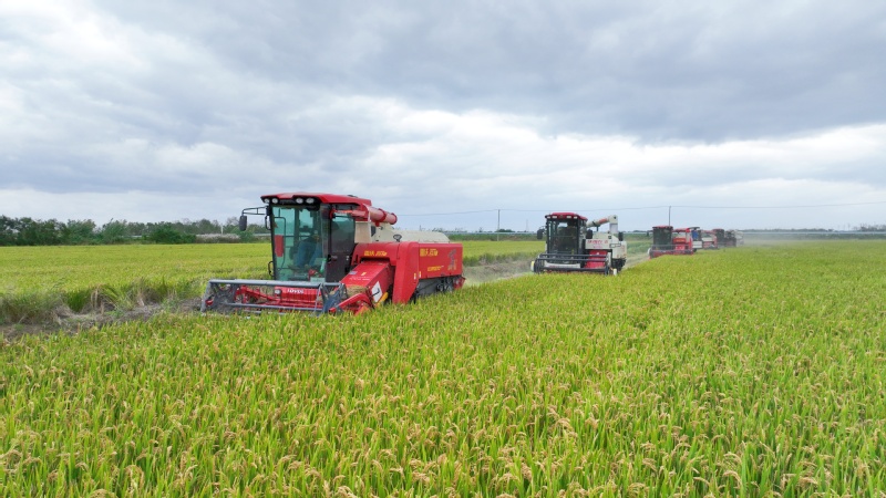 2025年10月10日,蘇墾農發崗埠分公司正在搶收水稻。秋收時節,天氣復雜多變,給秋收工作帶來一定困難,崗埠分公司按照“成熟一塊、收獲一塊”的原則,組織200多臺收運機械,集中力量加緊進行機械搶收作業,確保成熟玉米、水稻等秋糧及時歸倉。