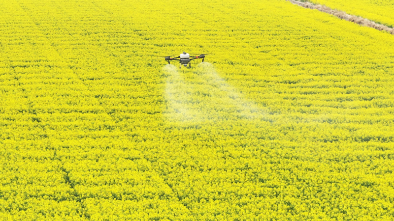 在蘇墾農(nóng)發(fā)臨海分公司25大隊油菜田上空,一架植保無人機正按照預設航線低空勻速飛行,細密的藥肥均勻地噴灑在每一株油菜上。