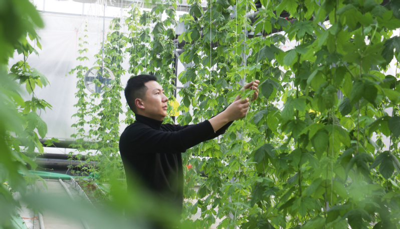 云臺農(nóng)場利用資源優(yōu)勢,積極與龍頭企業(yè)、科研機構對接,開發(fā)特色種植。目前,與蘇墾麥芽訂單種植的大棚啤酒花長勢喜人。圖為技術人員正在為新長出的啤酒花側枝繞蔓。