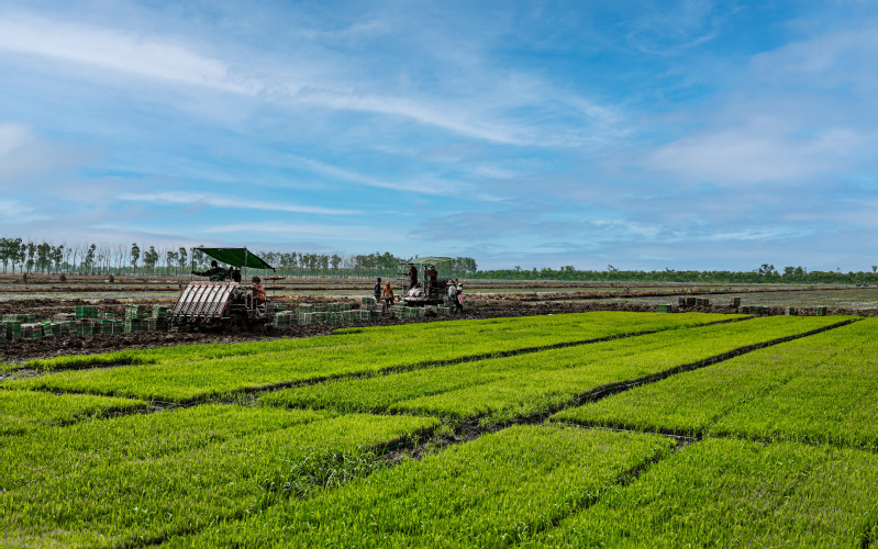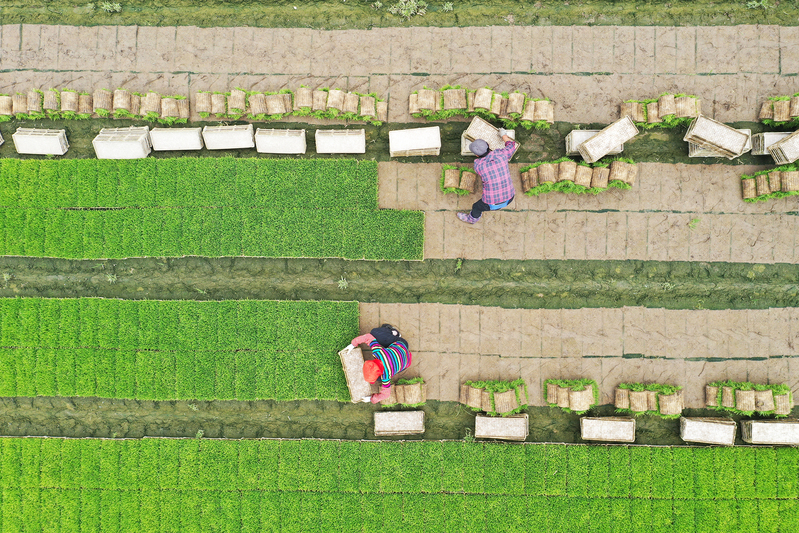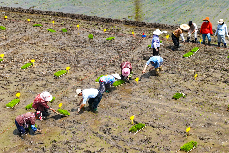 端午假期第一天,蘇墾農(nóng)發(fā)南通分公司3大隊(duì)田頭一片忙碌景象。烈日下,7位農(nóng)技人員彎著腰在水稻田一字排開移栽秧苗,腳下步履維艱、鼻頭汗珠滴落。按照隊(duì)伍兩頭農(nóng)技人員手拉的直線,他們小心翼翼地從秧盤上取下秧苗,左手握苗,右手插秧,確保行距25厘米,株距20厘米,每穴2株,橫豎成線、深度適中。每隔一段距離,田間都會(huì)插上一塊寫明實(shí)驗(yàn)數(shù)據(jù)的標(biāo)簽。“不同的標(biāo)簽對(duì)應(yīng)了不同的試驗(yàn)稻種。人工插秧可以確保水稻增產(chǎn)試驗(yàn)的科學(xué)性、嚴(yán)謹(jǐn)性、準(zhǔn)確性。”蘇墾農(nóng)發(fā)南通分公司農(nóng)業(yè)中心主任趙中華表示。今年,蘇墾農(nóng)發(fā)南通分公司大力推進(jìn)農(nóng)業(yè)科技創(chuàng)新,與南通大學(xué)生命科學(xué)學(xué)院合作開展水稻高產(chǎn)技術(shù)研發(fā),為南通稻米產(chǎn)業(yè)供給性結(jié)構(gòu)優(yōu)化、品質(zhì)提升、節(jié)本增效和綠色高產(chǎn)提供技術(shù)支撐。前期,校企雙方分別對(duì)南粳46、南粳5055稻種以微波、離心、超聲波等3種方式,按時(shí)間長度各進(jìn)行32種處理。落谷前,蘇墾農(nóng)發(fā)南通分公司對(duì)不同品種、不同處理的水稻種子提前進(jìn)行了篩選、收集、稱重、貼標(biāo)、裝袋等準(zhǔn)備工作,同時(shí)與相關(guān)農(nóng)業(yè)大隊(duì)溝通協(xié)調(diào)好浸種催芽時(shí)間,在種子露白后及時(shí)安排工人與農(nóng)機(jī),掌握好落谷的最佳時(shí)機(jī)與最優(yōu)質(zhì)量,控制種子秧盤播撒的均勻度,精準(zhǔn)把控好土壤濕度與精細(xì)