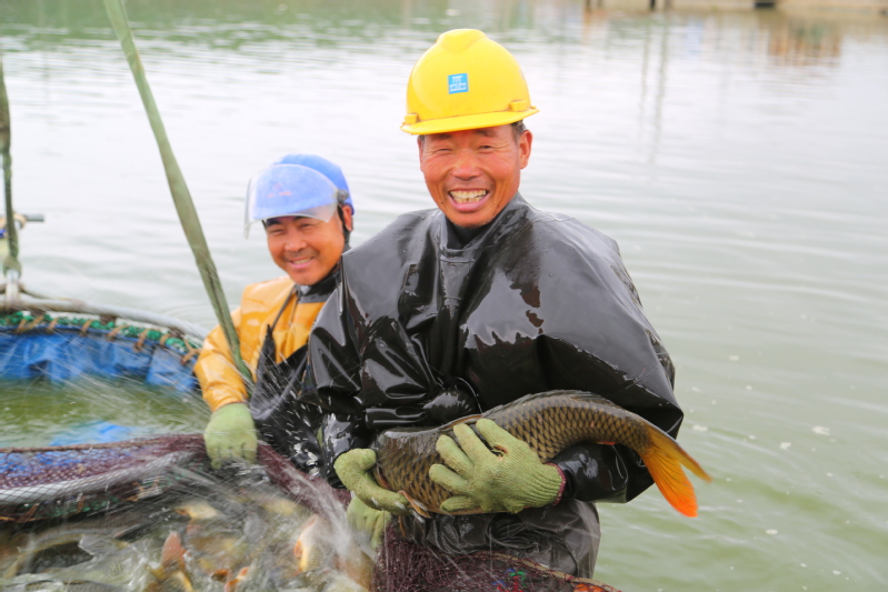 正值淡水魚出塘上市季節,崗埠農場南漁場,大型吊車正在起網捕撈鯉魚,一幅人歡魚躍的水上夏收景象。圖為漁民展示捕撈的大鯉魚。